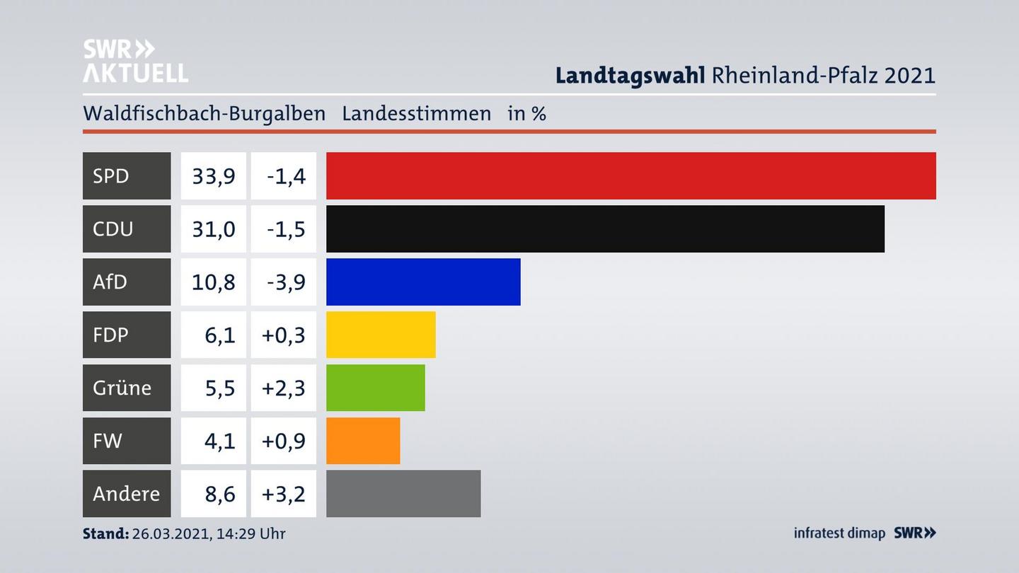 In Waldfischbach-Burgalben verliert die SPD leicht (-1,4 Prozentpunkte) und erzielt 33,9 Prozent der gültigen Landesstimmen. Die CDU erreicht 31,0 Prozent und verliert leicht (-1,5 Prozentpunkte). Die AfD erzielt 10,8 Prozent und verliert deutlich (-3,9 Prozentpunkte). Die FDP gewinnt leicht (+0,3 Prozentpunkte) und kommt auf 6,1 Prozent. Die Grünen erreichen 5,5 Prozent und gewinnen leicht (+2,3 Prozentpunkte). Die Freien Wähler erzielen 4,1 Prozent und gewinnen leicht (+0,9 Prozentpunkte). Die Wahlbeteiligung liegt bei 66,0 Prozent.